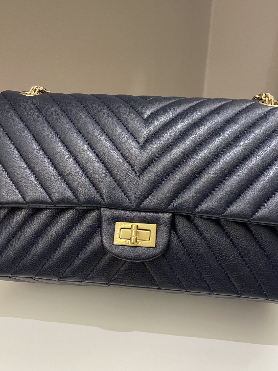 Chanel 2.55 227 Chevron Reissue Double FlapDark Navy Calfskin AGHWSize 31.5 x 19 x 7...