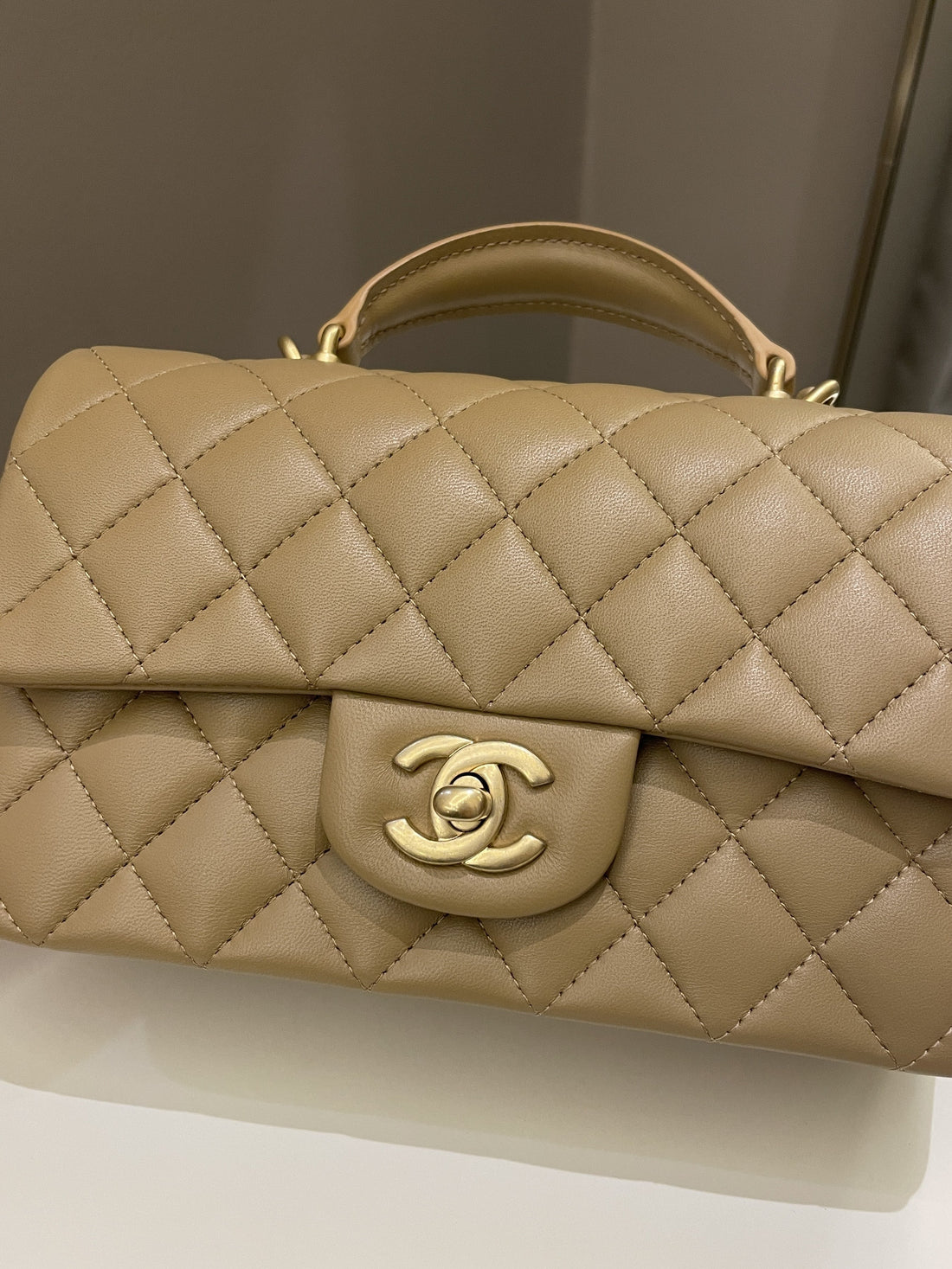 Chanel 22B Quilted Metal Top Handle Mini Rectangular Dark Beige Lambskin