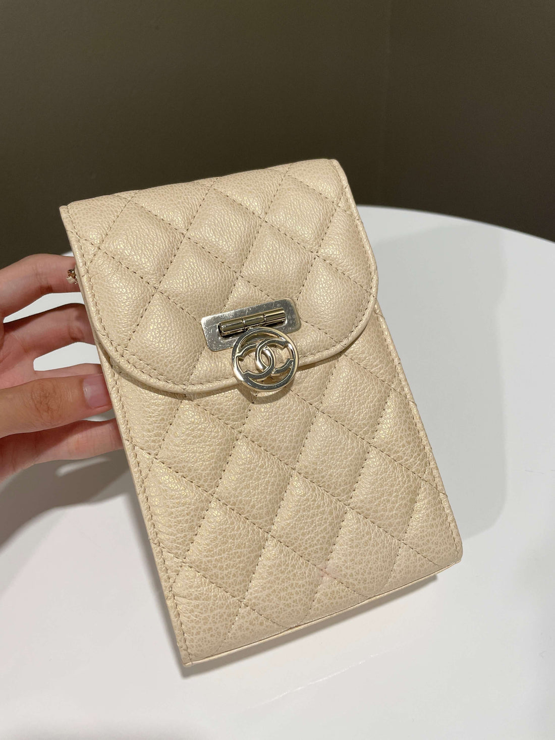 Chanel Quilted Cc Vertical Phone Clutch On Chain Iridescent Champagne Caviar