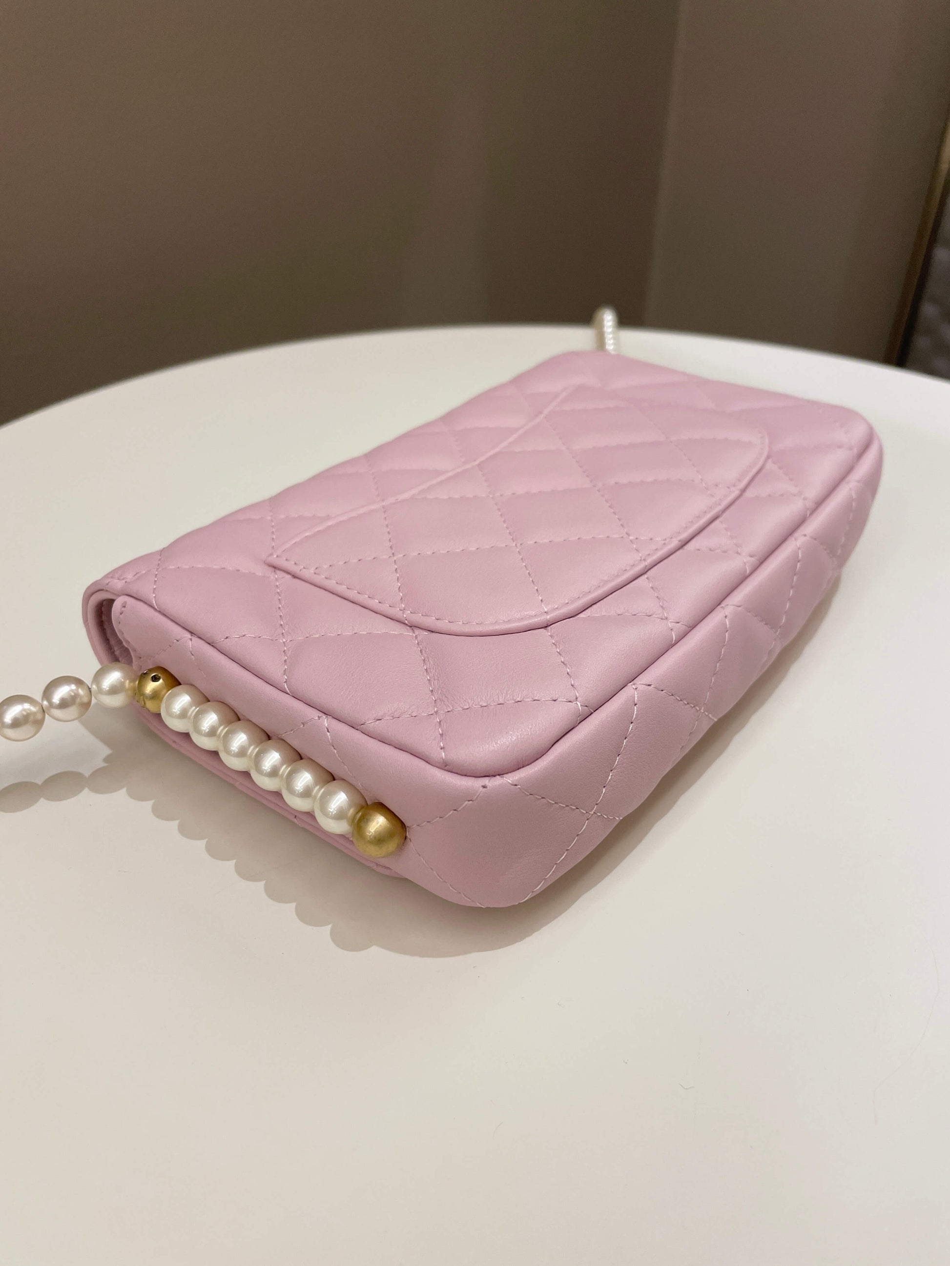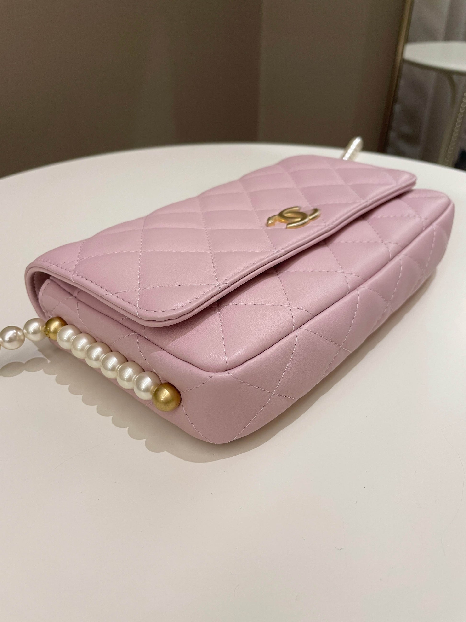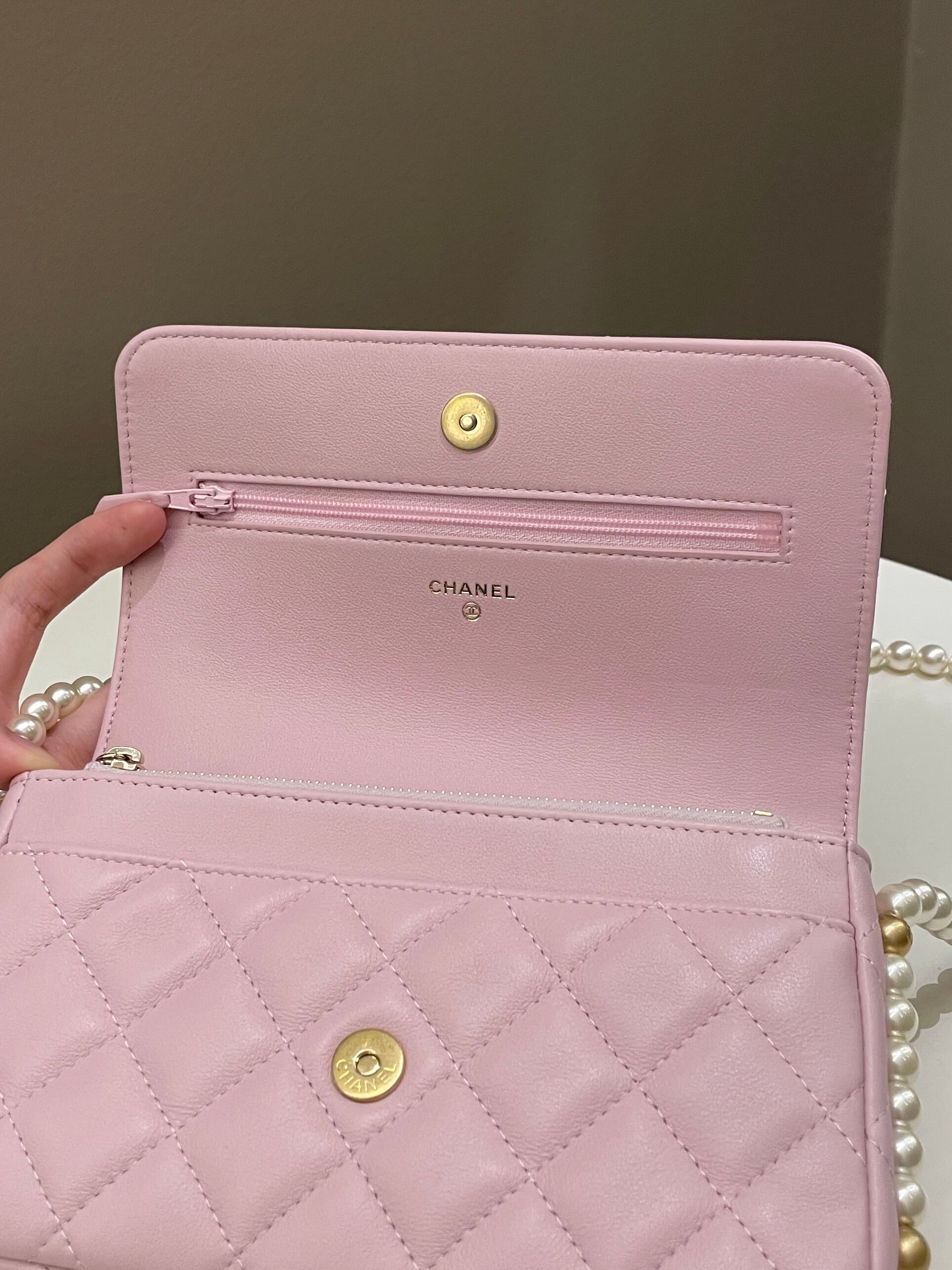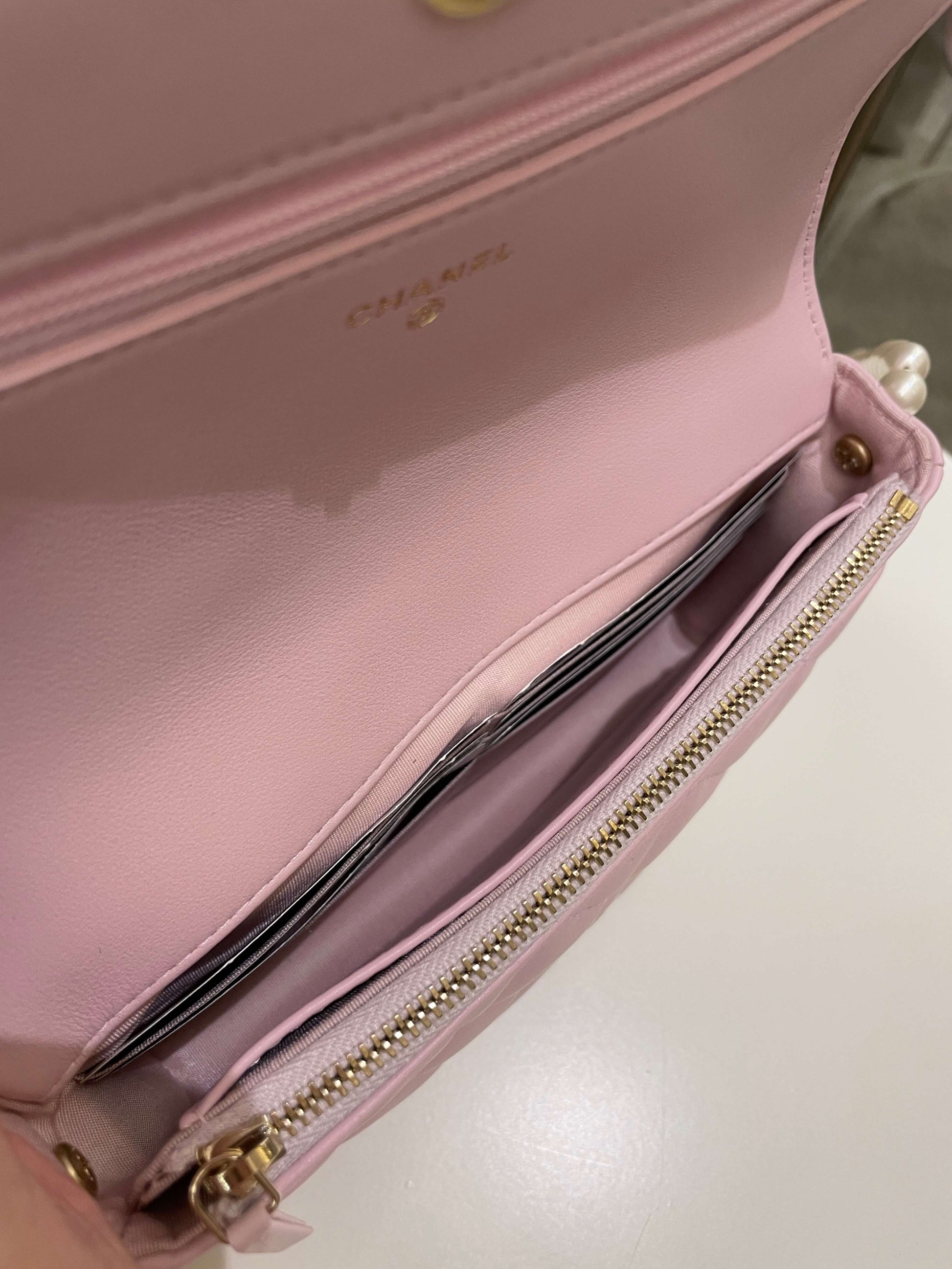 Chanel 21S Quilted Wallet On Chain With Pearl Baby Pink Lambskin