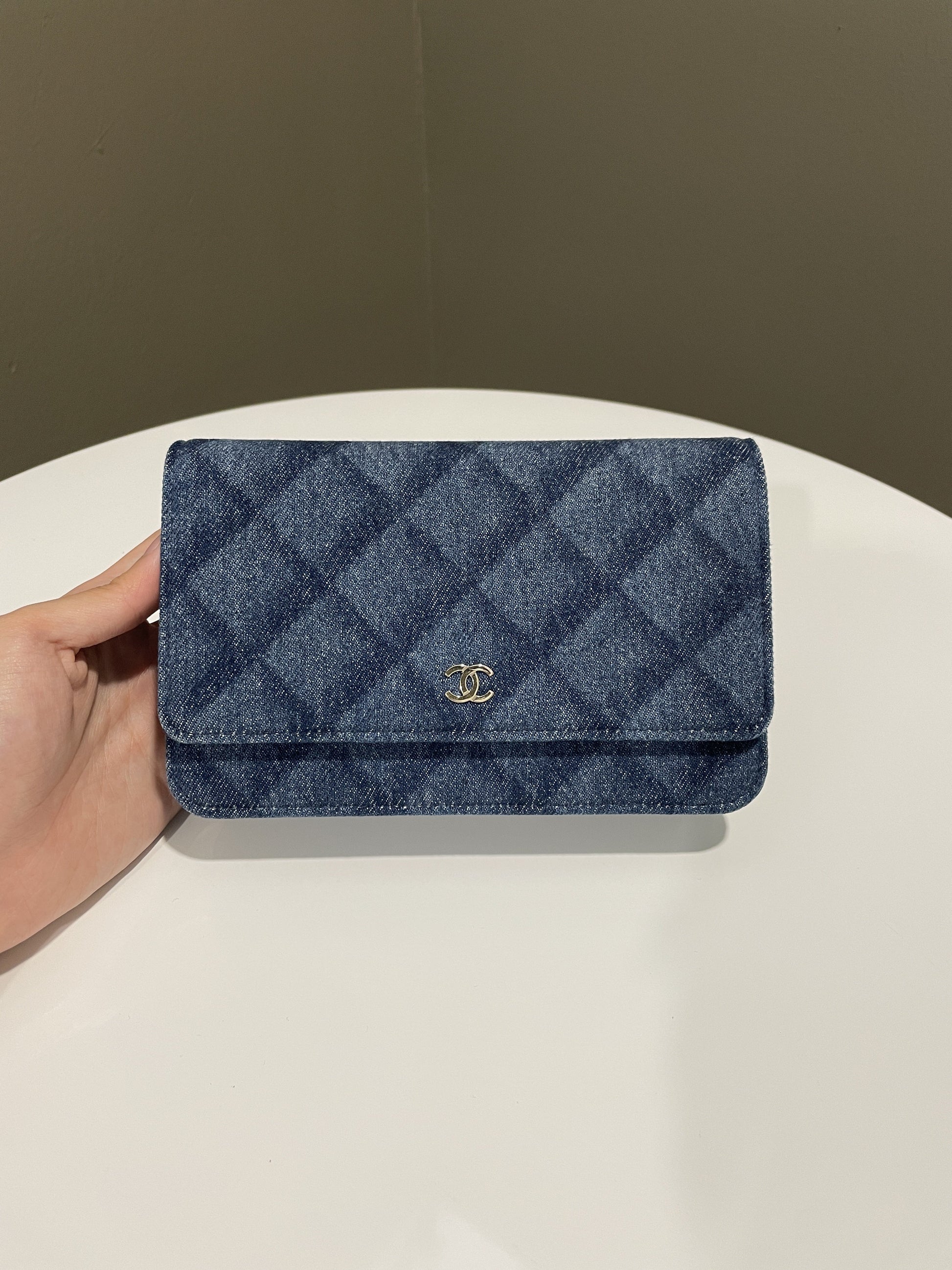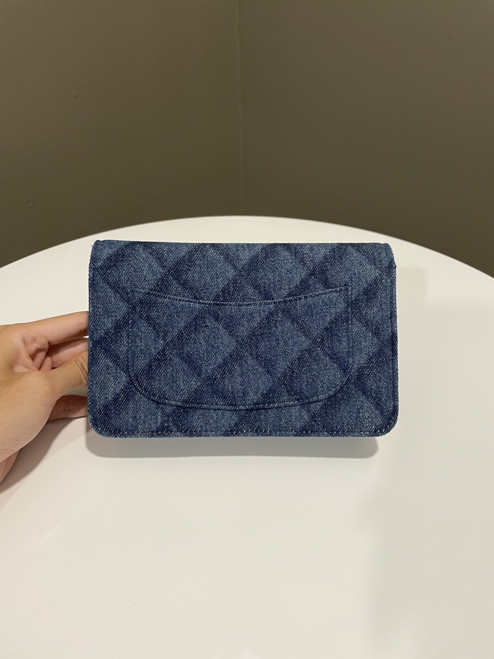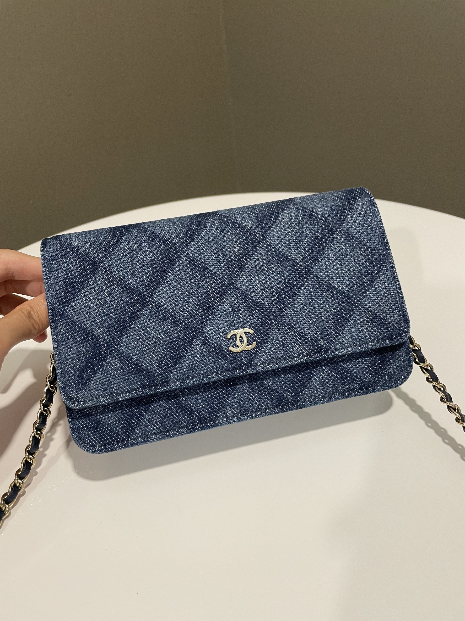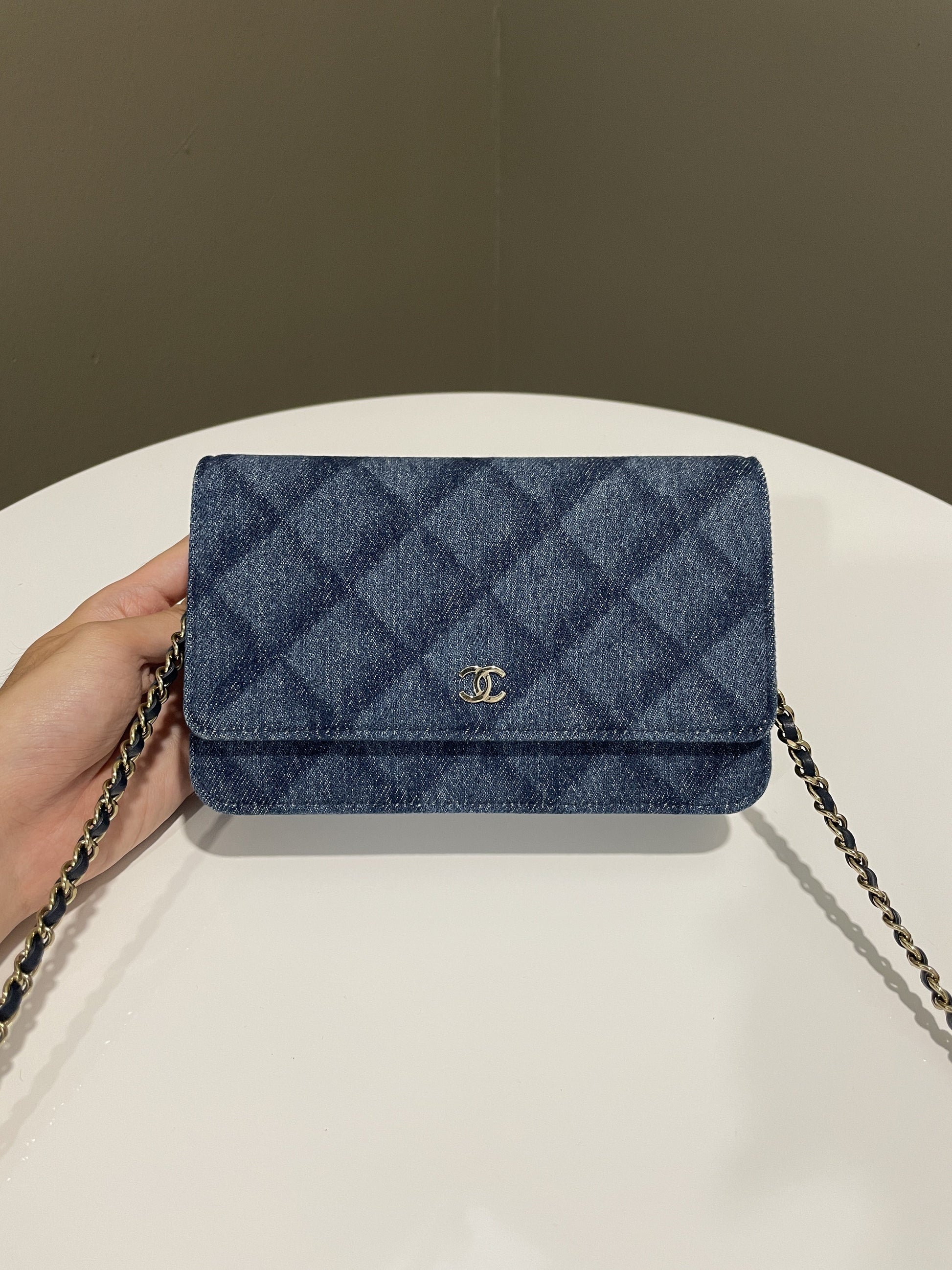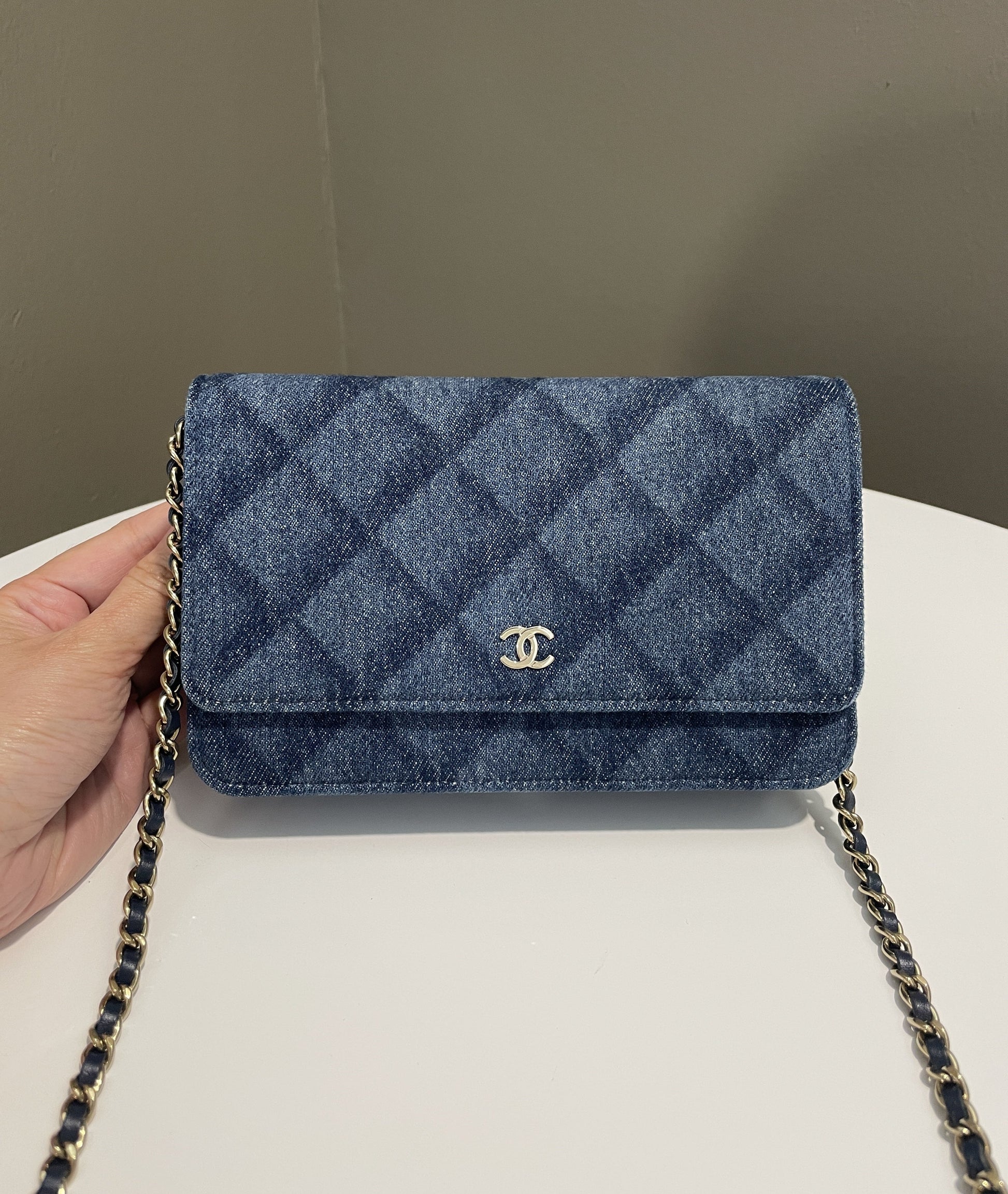 Chanel 22B Classic Quilted Wallet on Chain Blue Denim