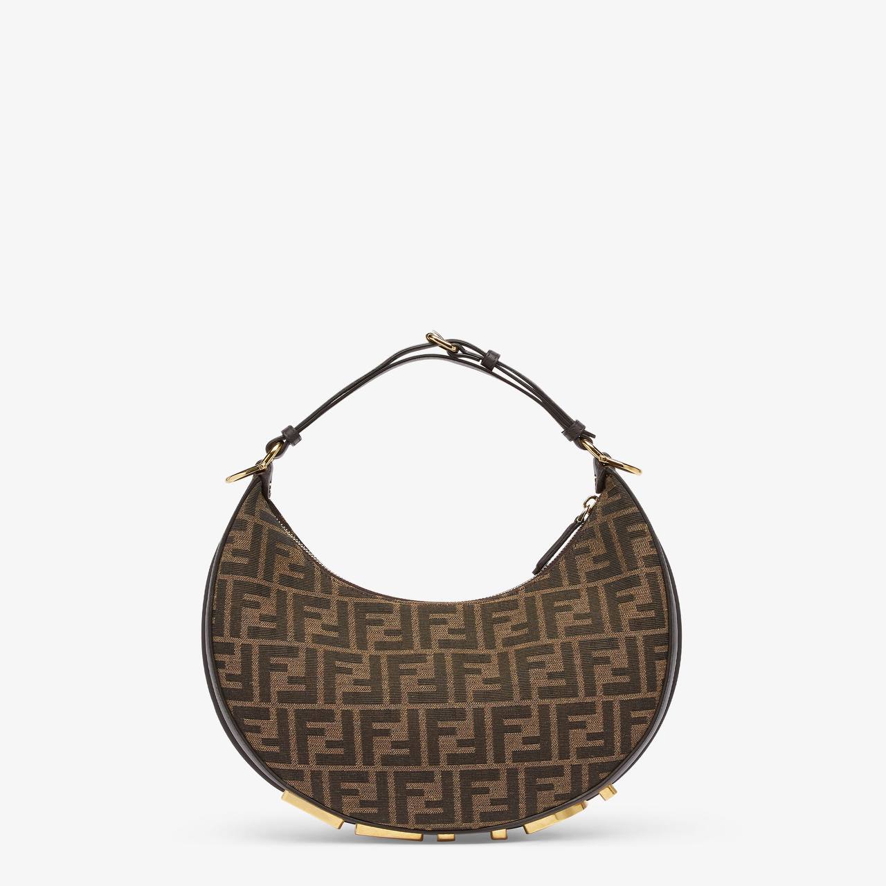 Small hobo bag made of brown FF fabric, decorated with vintage gold metal FENDI lettering visible when wearing the bag under the arm.