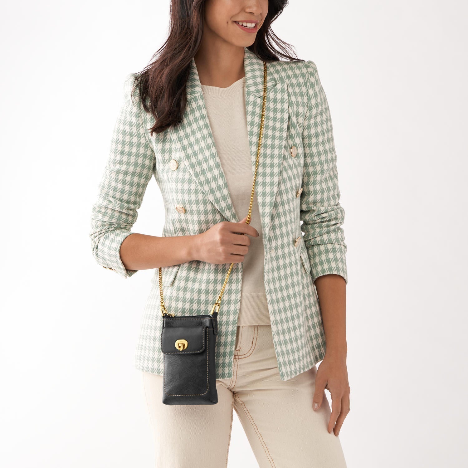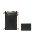 Additional Product Details:ÿCard Case: Material: Eco Leather/Polyurethane Trim, Interior Material: 100% REPREVE? Recycled Polyester, Interior Details: 2 Credit Card Slots, Measurements: 4" L x 0.5" W x 2.75" H, Silhouette: Phone Bag, Platform: HARPER, Primary Color: Black, Hardware: Gold Tone, Closure: Flip Lock