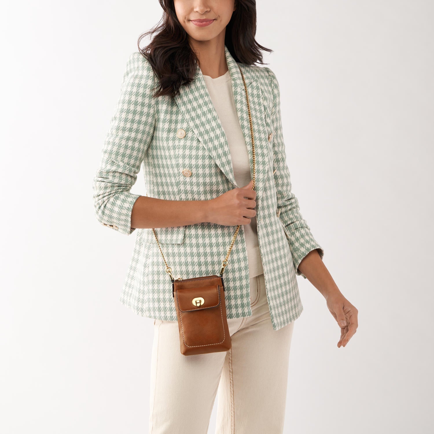 Additional Product Details:ÿCard Case: Material: Eco Leather/Polyurethane Trim, Interior Material: 100% REPREVE? Recycled Polyester, Interior Details: 2 Credit Card Slots, Measurements: 4" L x 0.5" W x 2.75" H, Silhouette: Phone Bag, Platform: HARPER, Primary Color: Brown, Hardware: Gold Tone, Closure: Flip Lock